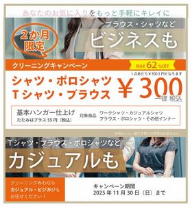 - 【11/30(日)まで】対象商品一律300円、クリーニングキャンペーン!