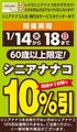シニアナナコ10%引! 1月14日(水)から18日(日)までの期間 シニアナナコをレジにかざすだけ! 期間中1回限り! ※他の割引・クーポン企画との併用はでき